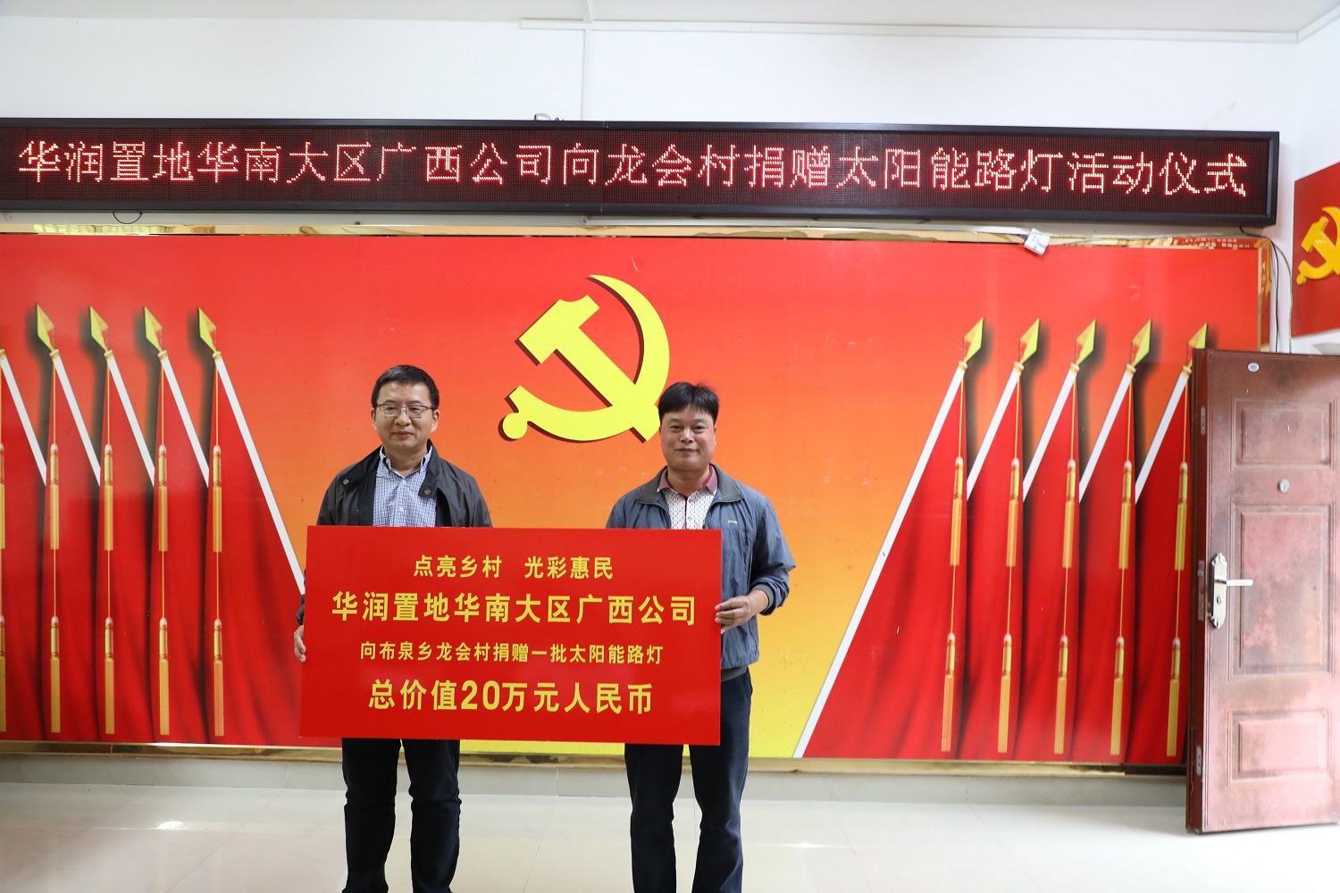 得知情況后,南寧市自然資源局積極牽線搭橋,并迅速得到華潤置地華南大區(qū)廣西公司的響應,為龍會村捐贈了400套的太陽能壁燈和40套立桿太陽路燈,總價值20萬元。目前,這批太陽能路燈已全部到位,等路燈全部安裝好后,將可以有效地解決村民夜間出行難的問題。