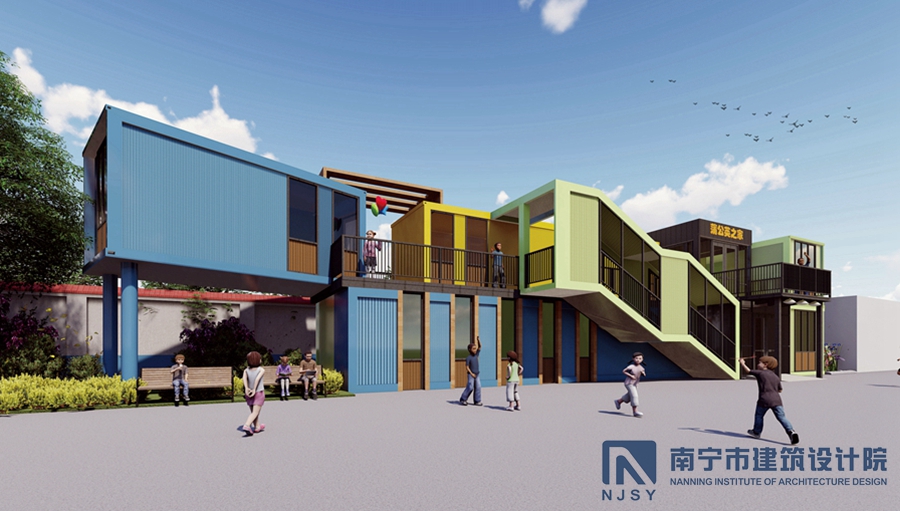 項目采用了集裝箱房屋的形式,由10個集裝箱構成,通過堆積木的形式,根據學生兒童所需的建筑風格和功能需求,將集裝箱橫豎排列,形成一定的退臺和露臺空間,為孩子們提供更多共享活動空間。