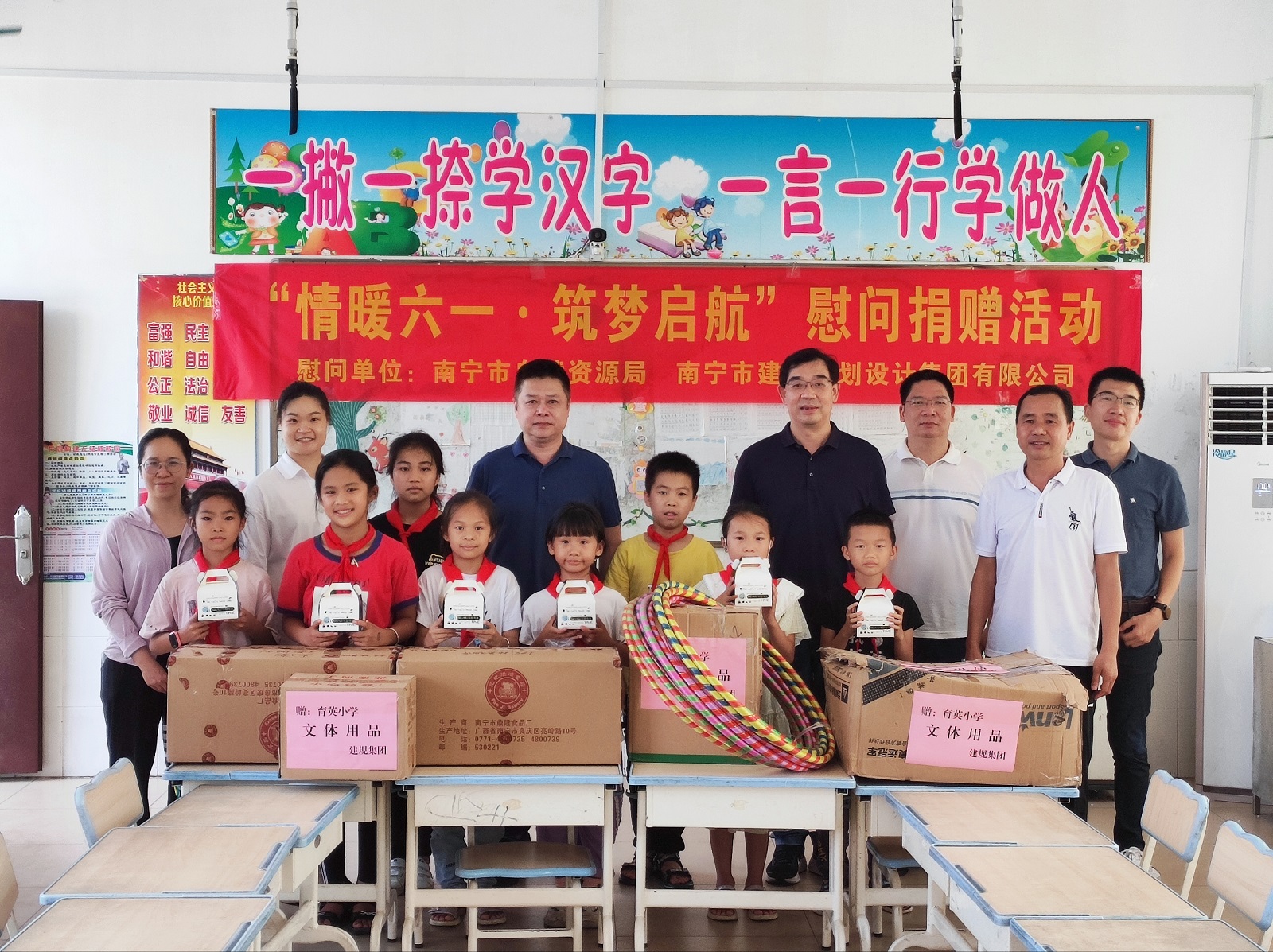 南寧市自然資源局機關黨委專職副書記陳志勤,集團黨委書記、董事長韋文學,總經理、副董事長馮江泉,黨委副書記、董事趙鋼及相關負責同志參加慰問捐贈活動,為孩子們送上節日的美好祝福。